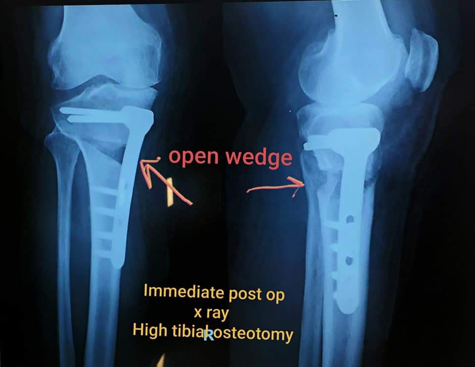 This surgical procedure involves cutting and realigning the upper part of the tibia bone to relieve pressure on the damaged or arthritic area of the knee joint. By creating an open wedge, the joint's alignment is corrected, reducing pain and restoring function while preserving the natural joint.